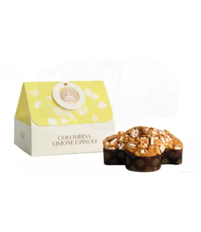 Colombina (paasduifcake) zonder gekonfijt fruit, met Siciliaanse citroenpasta en -essence, afgewerkt met glazuur en pijnboompitten.
