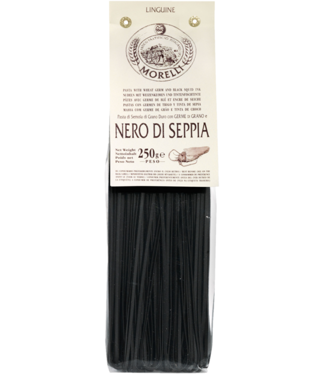 Morelli Nero di Seppia is een ambachtelijke Italiaanse pasta waaraan inkt van de sepia (inktvis) is toegevoegd. Daardoor krijgt de pasta een diepzwarte kleur, een subtiele zee-achtige smaak en een elegante, luxe uitstraling.