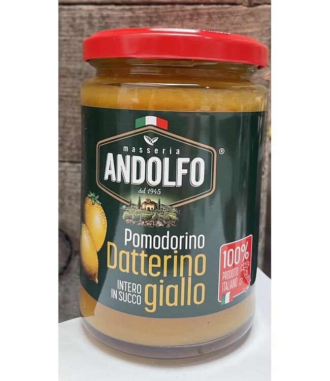 Pomodorini Datterini Gialli in glas van Masseria Andolfo: zoete, volle gele tomaatjes, perfect voor salades, bruschetta, pasta of antipasti. Fris, kleurrijk en authentiek Italiaans