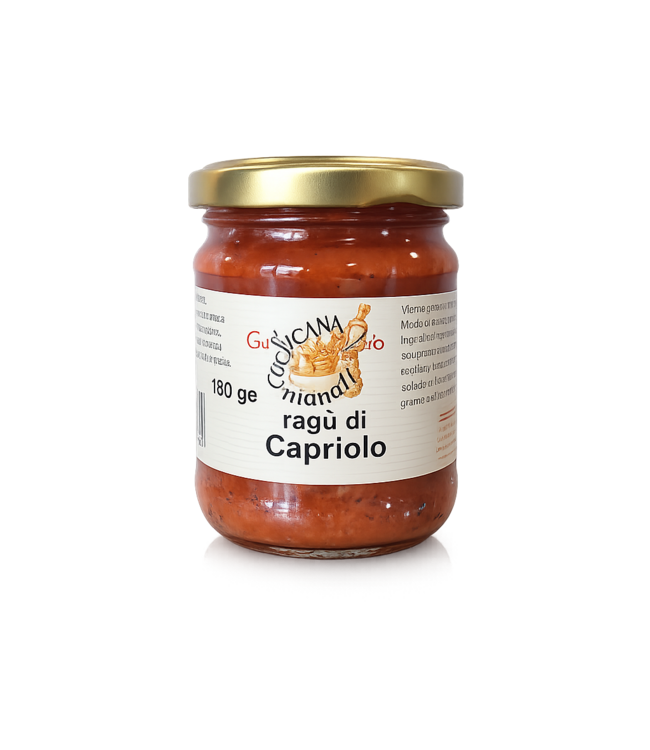 Verfijnde Toscaanse ragù van ree (capriolo) en tomaat, langzaam gegaard voor een volle, rijke smaak. Het malse wildvlees geeft een subtiel aards en elegant karakter, perfect in balans met de frisse tonen van tomaat. Ideaal bij pasta, polenta of als hartige smaakmaker in traditionele Toscaanse gerechten.